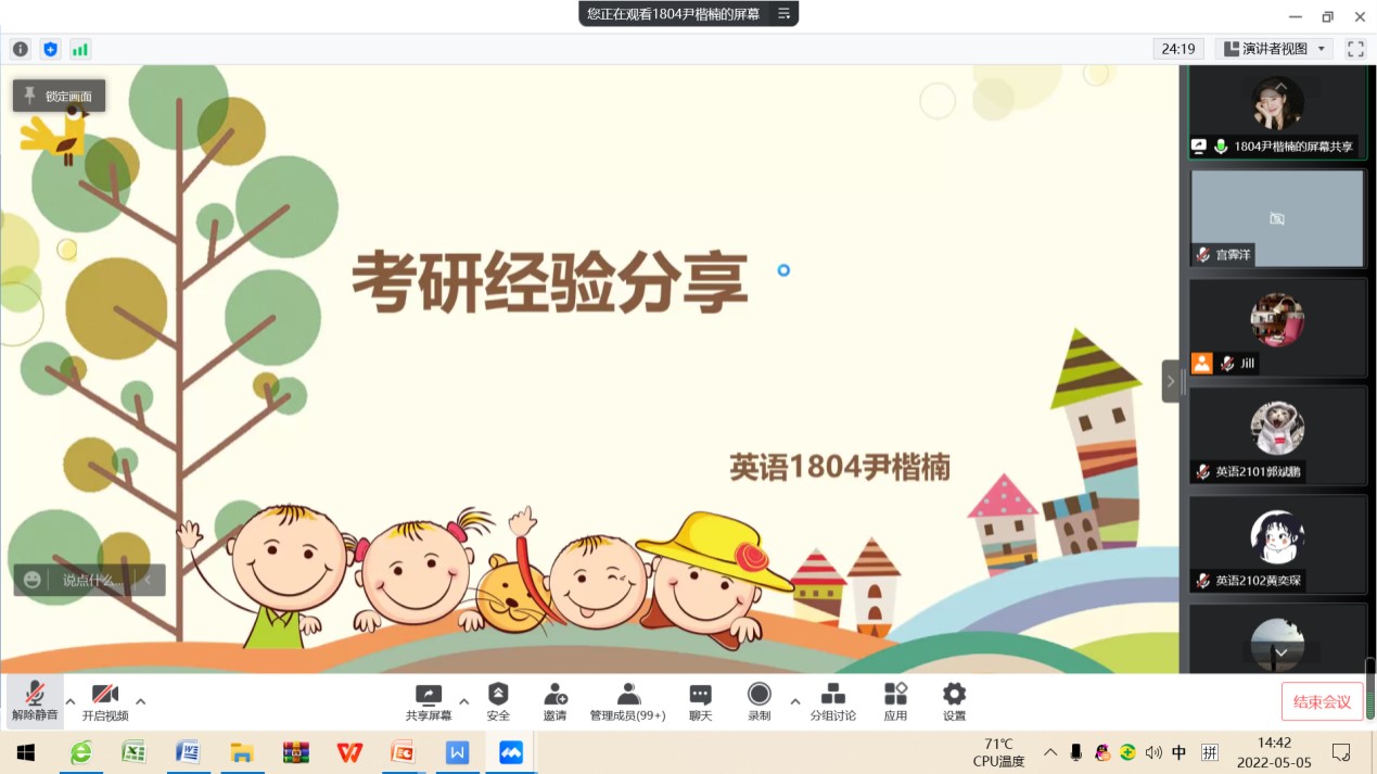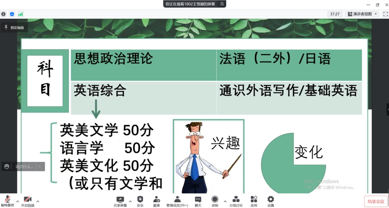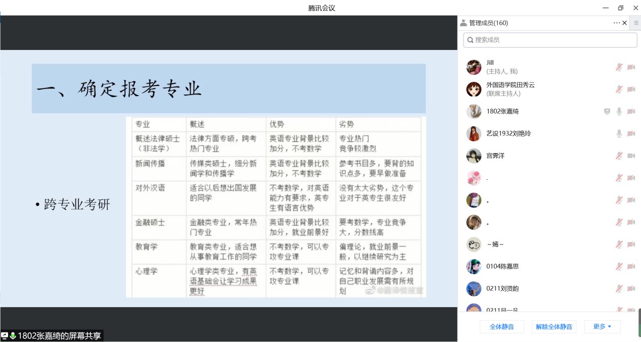 2022年5月5日下午,M88官方网站英语专业通过腾讯会议召开了考研暨就业交流会。会议由教学部主任王静老师主持,邀请2018级9位成功考取硕士研究生以及顺利就业的员工交流心得和分享经验,2019级、2020级以及2021级170余名员工与会交流。学长从选择考研公司和专业、复习备考、调剂公司、就业和备考教资五个方面分享了自己的经验,并鼓励学弟学妹们平时注重知识积累和能力培养。