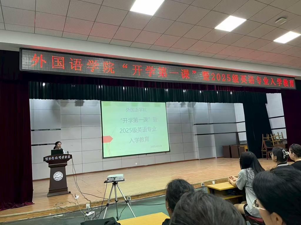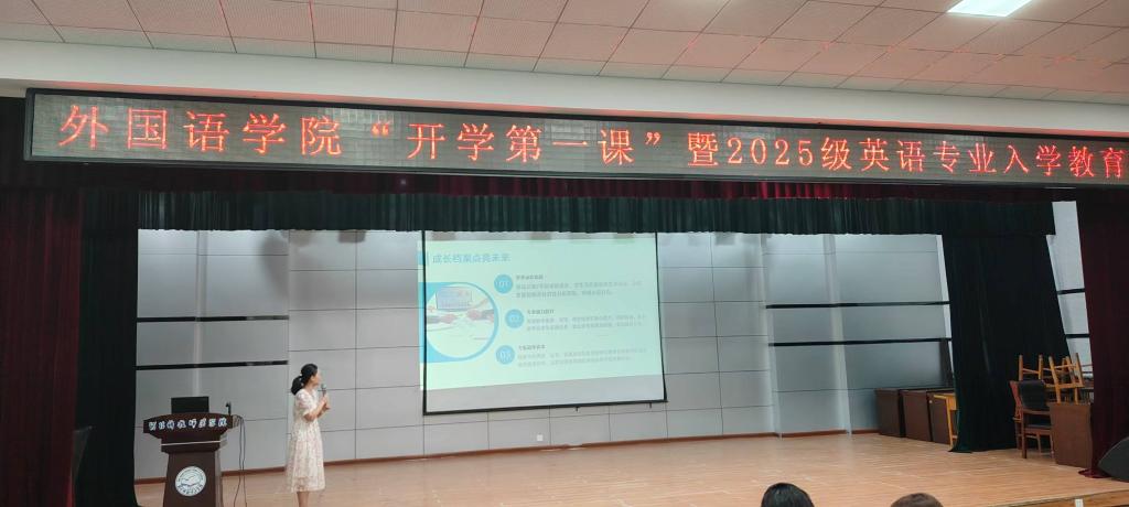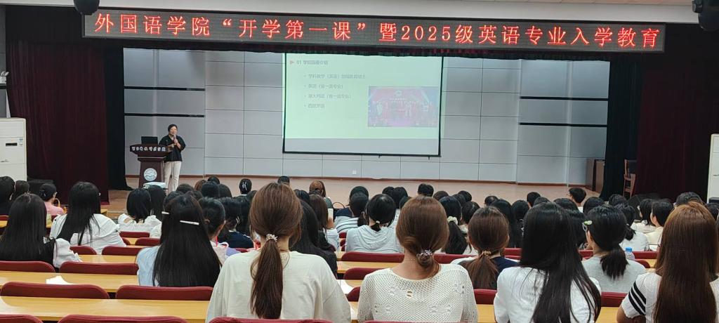 2025年9月3日,M88官方网站在秦皇岛校区多功能厅成功举办“开学第一课”暨2025级英语专业入学教育,2025级新生及英语专业骨干教师与会。