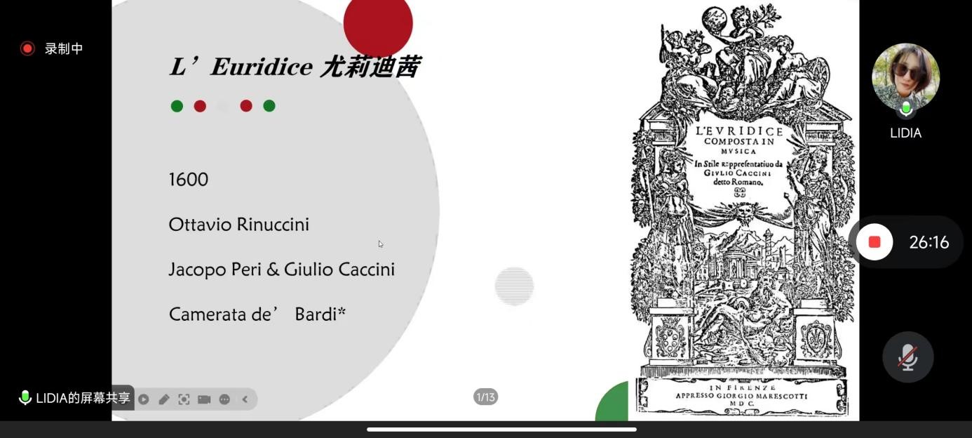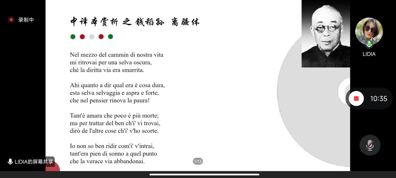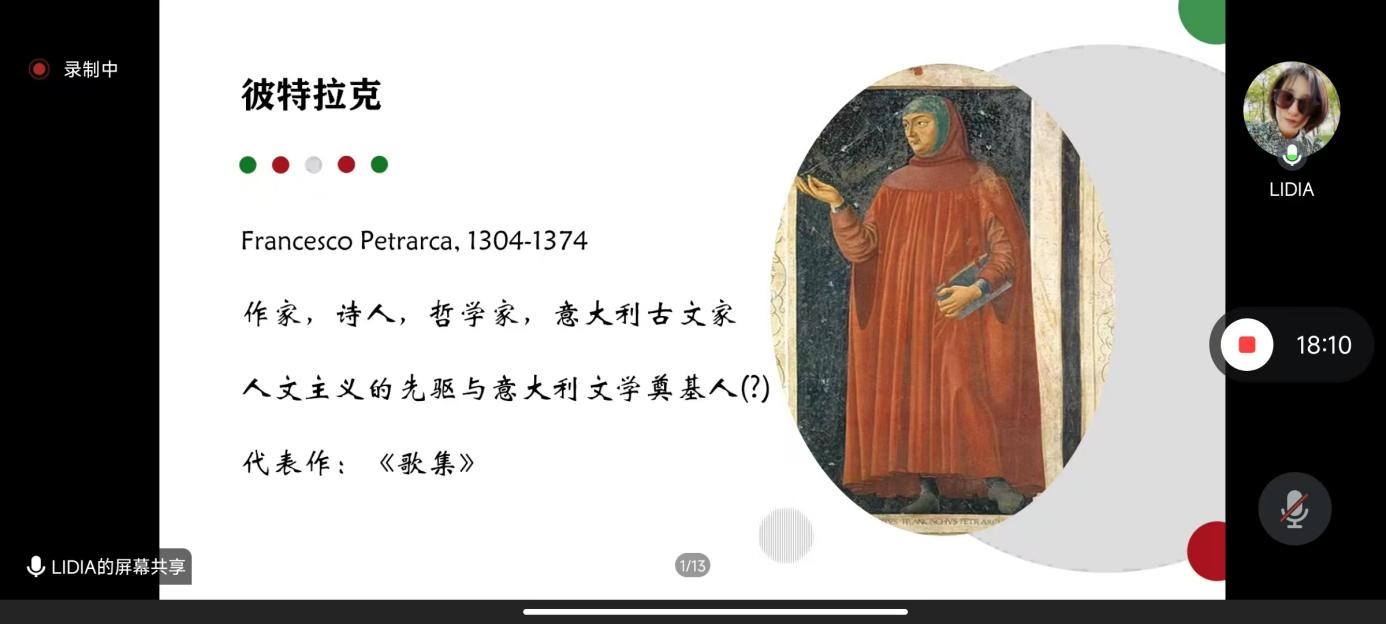此次讲座邀请到了国家大剧院剧目制作主管、排演翻译高思老师。意大利语教学部主任王敏老师一同参与了本次活动。这次讲座的主题是诗歌,主要围绕意大利的诗歌进行对比交流。高思老师为同学们带来了关于意大利语音韵之美、诗歌中的意大利语、脚本中的意大利语等丰富、精彩的内容。意大利语以其元音、R音、词汇、音节与重音而达到音韵之美。高老师列举了但丁、彼特拉克、班伯三位意大利诗人的作品,让大家领略到了诗歌中的意大利语。关于但丁的神曲这一作品,她还着重讲解了几个著名的国内译本,分析其特殊精妙之处。最后,高老师以尤莉迪茜、提托的仁慈、塞维利亚的理发师、乡村骑士、图兰朵等作品,讲述了阿卡迪亚学派与与正歌剧中的不同倾向,让我们了解到了歌剧脚本中的意大利语。