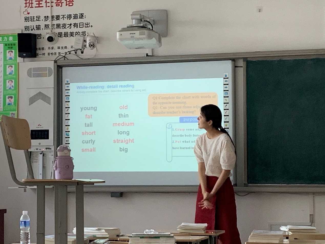 实习生一人负责七年级两个班的英语阅读课和视听说课的教学,参与听课、评课、阅卷、作业批改等。观摩优秀教师的英语公开课两次,参与英语组的教研活动,初三英语教师说课分享等。