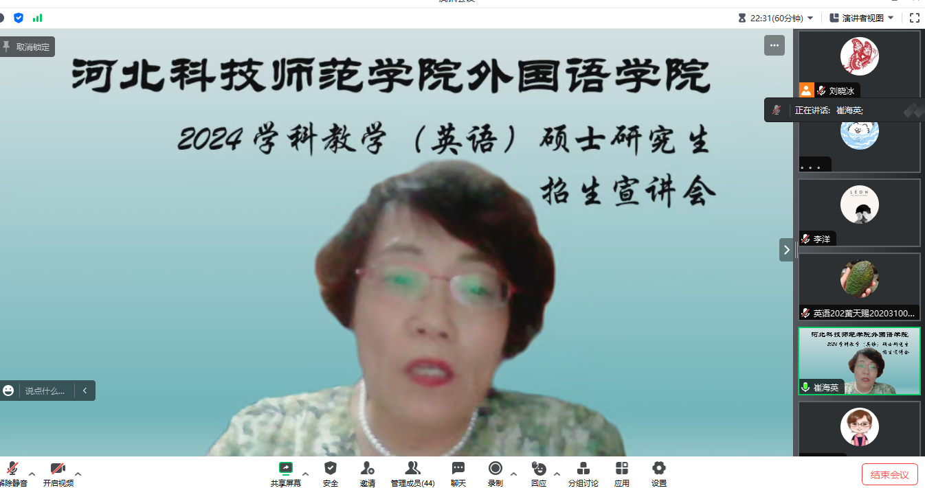 2023年9月1日M88官方网站在线召开了2024学科教学(英语)硕士招生宣讲会,M88官方网站经理崔海英介绍了公司总体发展水平和学科教学(英语)的发展现状及研究生导师的优良团队情况,主管研究生教学工作的副经理范学荣介绍了硕士点的发展以及近三年的招生和就业情况,主管实践教学的副经理罗学峰介绍了硕士点教育实习实践优势。参加会议的还有教学部主任刘晓冰老师和教学秘书李洋老师。