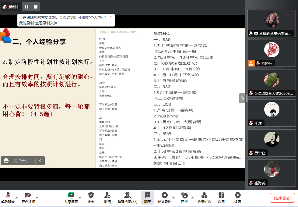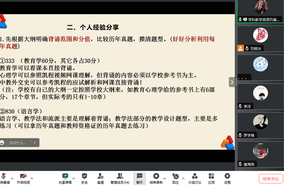 在目前考研竞争激烈就业压力大的形势下,根据自身的情况选择适合自己的考研院校有助于提高毕业生的竞争力。本次参会的同学有来自本校准备考研的大四和大三的同学,以及来自河北和天津的部分高校员工。会议邀请了22级在读硕士刘美蓉同学在线分享考研专业课的复习经验并解答了参会同学的提问。
