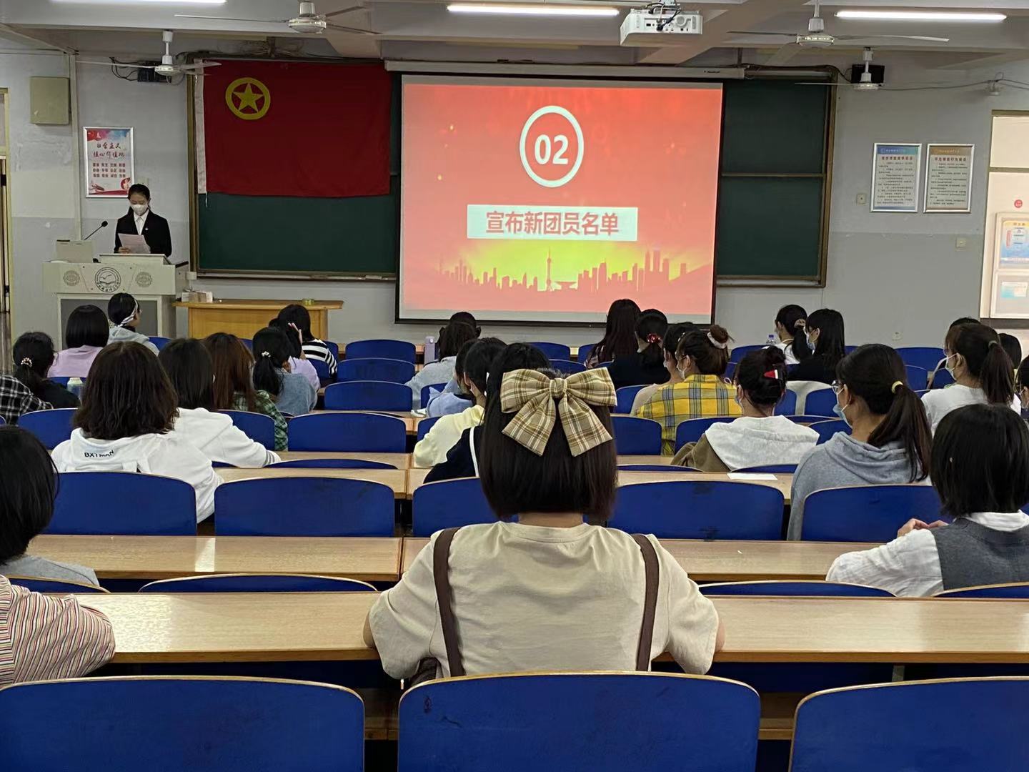 首先,全体起立打团旗、唱团歌,由团委副书记王一冰宣布新团员名单并向全体团员进行公示批复,并对新入团的团员们表示祝贺与欢迎。随后,公司员工会主席邵欣然为新团员佩戴团徽,青年发展部部长张梦盼宣读《团章》中有关团员权利和义务的条款。接着新团员代表西班牙语2001团支部刘涵上台发言并带领全体团员宣誓,老团员重温入团誓词;老团员代表英语2002团支部书记颜烨堃上台发言,讲述了自己加入共青团的体会和成长经历,并对新团员的发展提出了建议和希望。