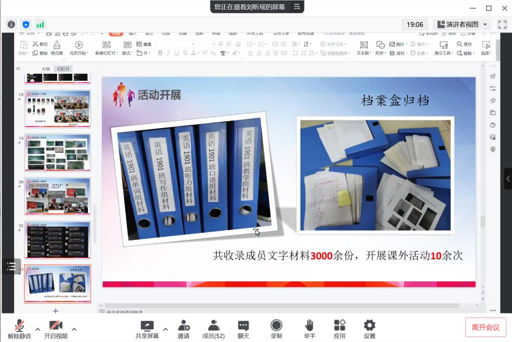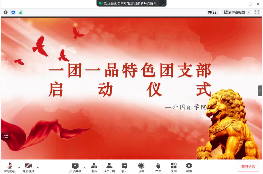 4月30日下午13:50M88官方网站19-21级全体团干进入腾讯会议,进行签到。仪式开始,进行活动第一项内容,打团旗唱团歌;活动第二项,由两个上一年度校级一团一品的团支书讲述和分享了本支部“一团一品”的创建方案和实施计划,以及创建过程中可能会遇到的问题。英语1904团支部的团支书牛嘉浩表示,在校级一团一品特色团支部活动中,支部成员要团结互助,齐心协力,共同打造出优质、特色、新意的品牌项目活动。最后,由青年发展部负责人张梦盼发表总结讲话,表示对各支部“一团一品”活动的极高热情表示欣慰,期盼着各支部成员将支部创建成积极向上的、具有强大影响力的团支部!