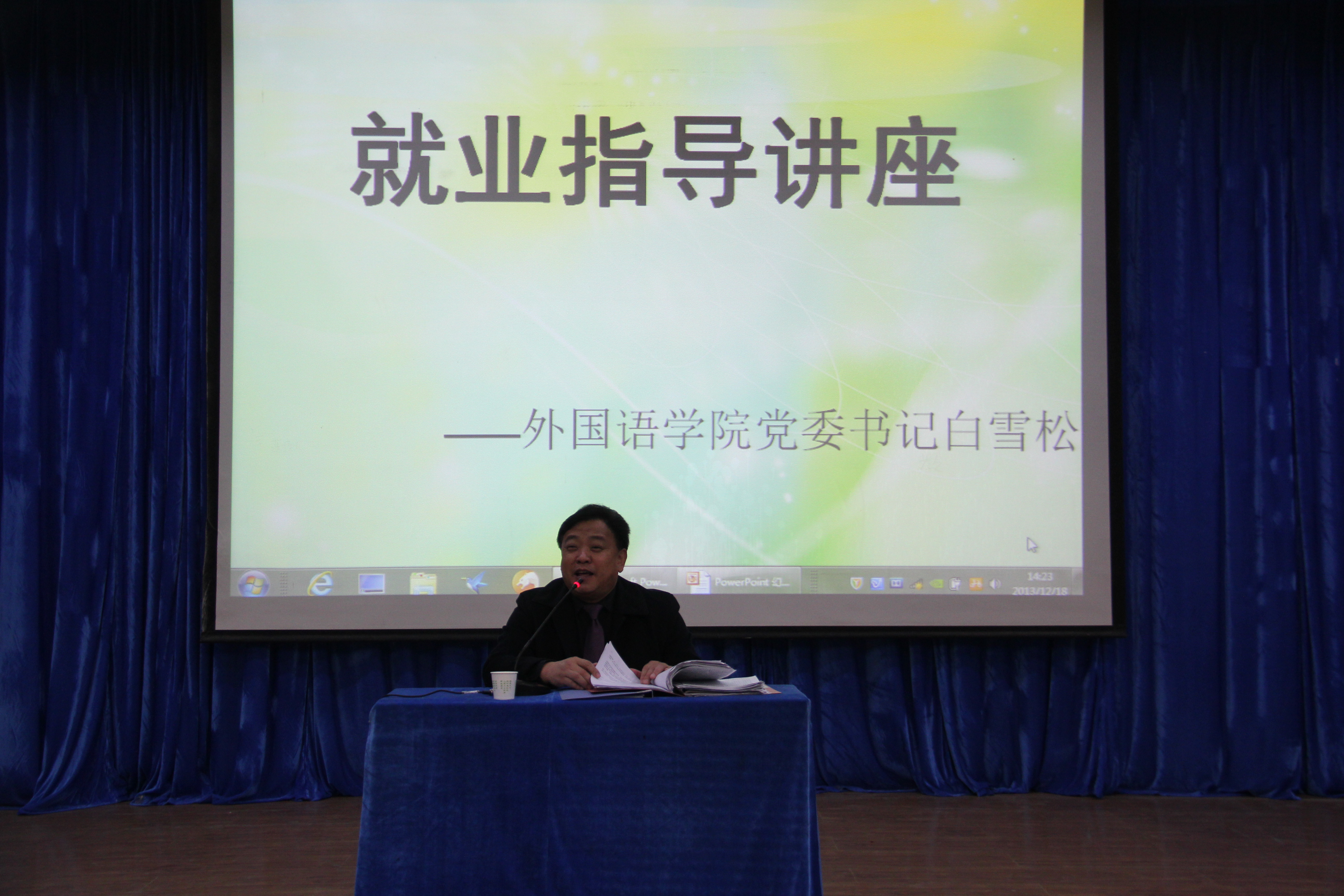 2013年12月18日下午两点,M88官方网站外国语公司党委书记白雪松老师在二楼报告厅给全体毕业生做了一场以“2014届毕业生就业形势分析”为主题的讲座。班级辅导员以及学工办各位老师参加了本次讲座。