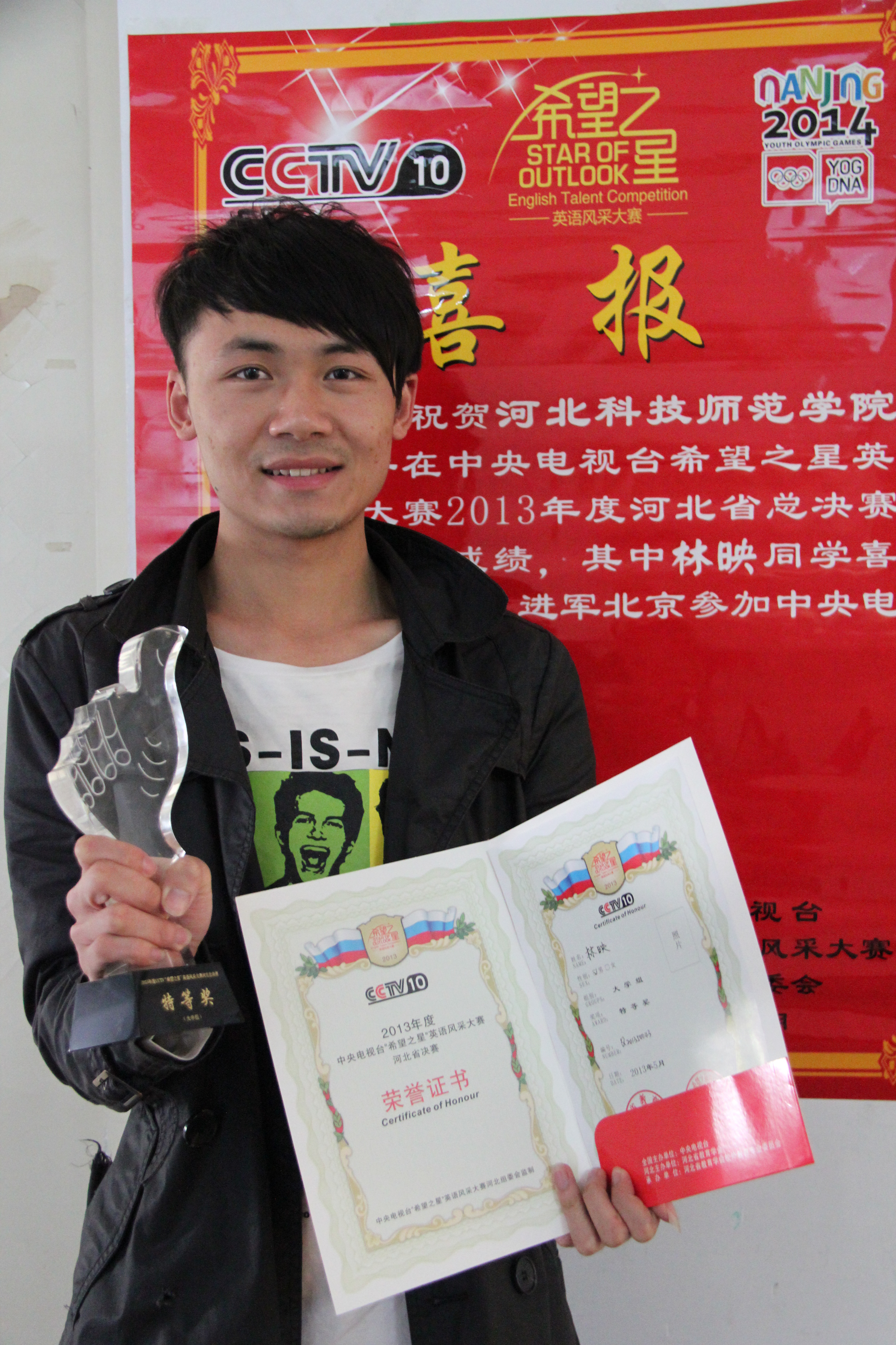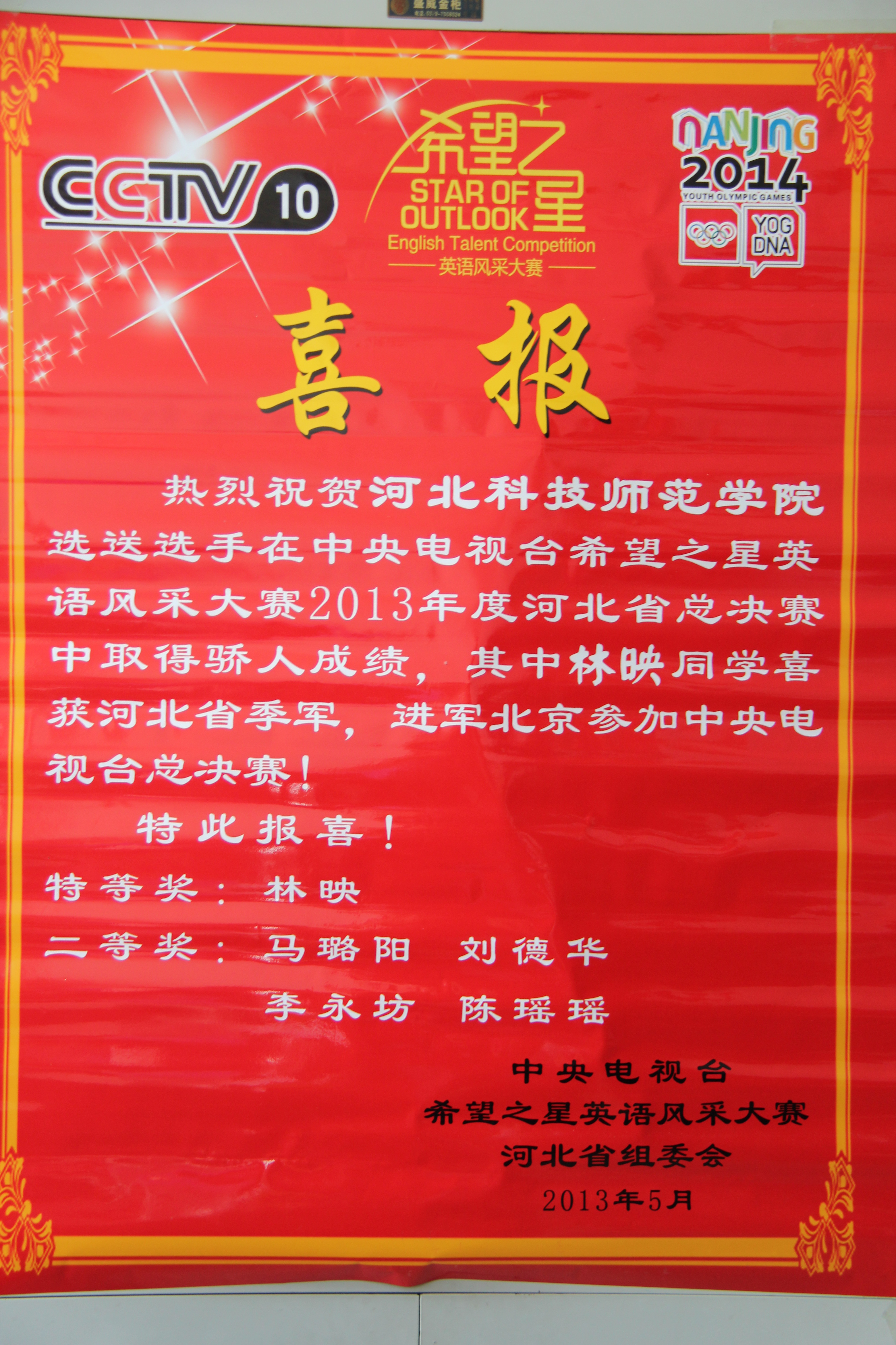 公司选手在河北省希望之星英语风采大赛总决赛中表现优异,其中公司员工林映获得河北省季军,将进军北京中央电视台参加总决赛。另有马璐阳、刘德华、李永坊、陈瑶瑶四名同学获得二等奖。