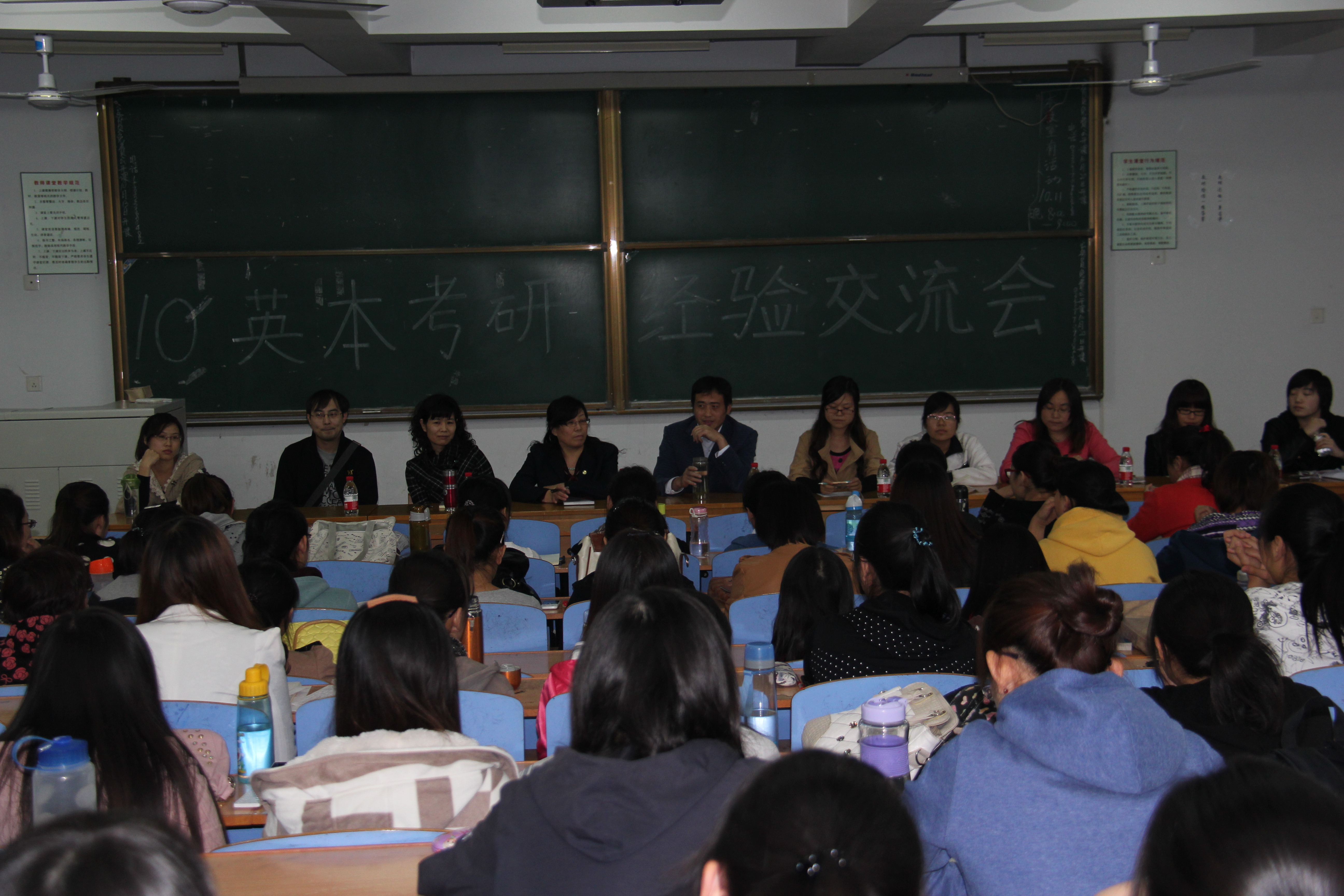 10月18日,M88官方网站10级英本专业全体同学在312室举行考研准备经验交流会。外国语公司党委书记刘朝晖老师、M88官方网站经理邵丽君教授、英语本科教研室张喜荣博士、周鹏宇老师、商务英语教学部靳帆老师和英本09级准备考研的王慧娟等5名同学参加了此次交流会。