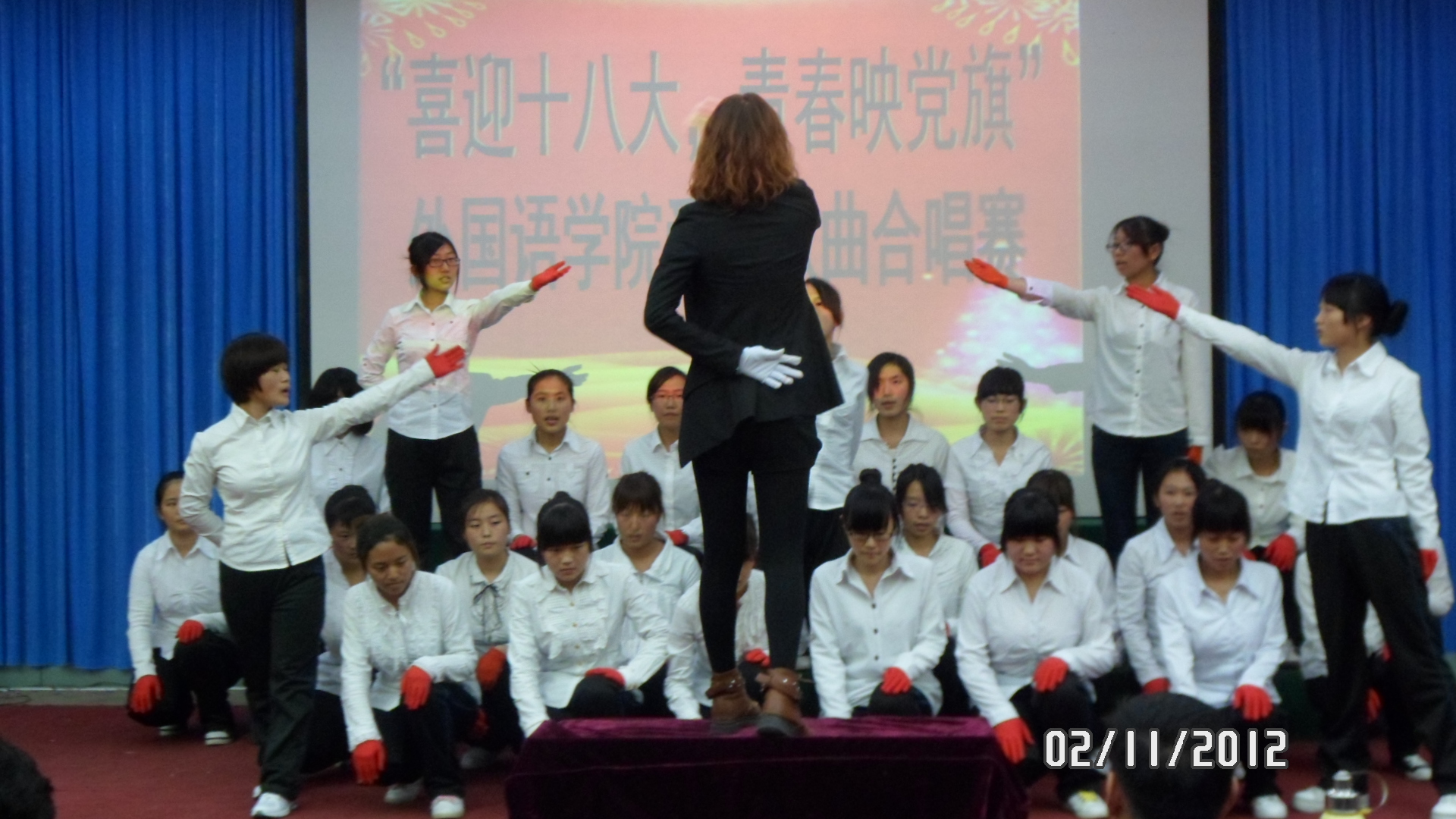 为了激发广老员工爱国热情,丰富广老员工的课余文化生活,同时也为了展现当代老员工的风采,M88官方网站于 2012年11月2日晚七点在综合楼二楼报告厅举行了“喜迎十八大,青春映党旗”爱国歌曲合唱赛。外国语公司党委书记刘朝晖、经理邵丽君、副经理游建民、副经理崔海英和学工办老师及各班级辅导员出席了本次比赛。