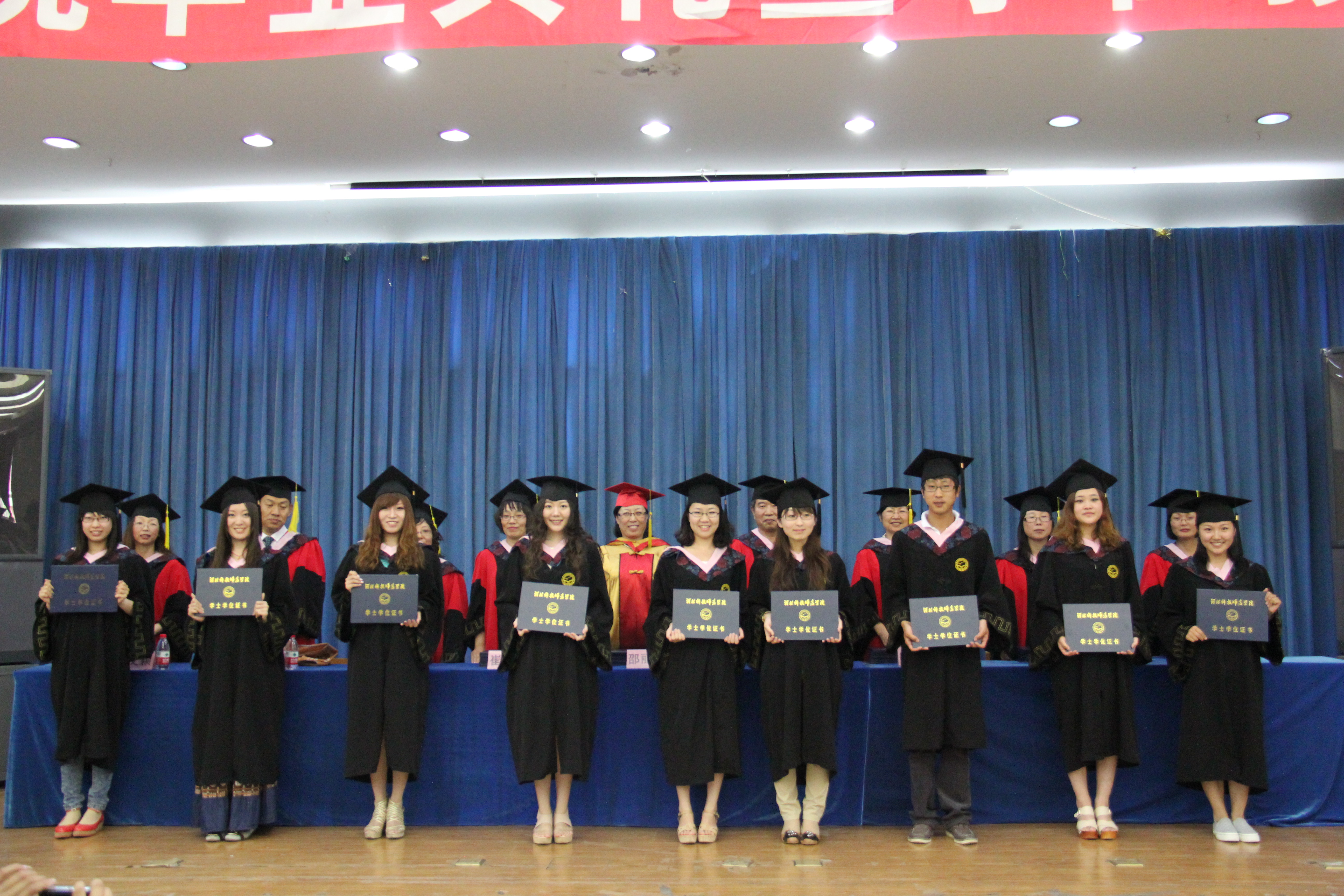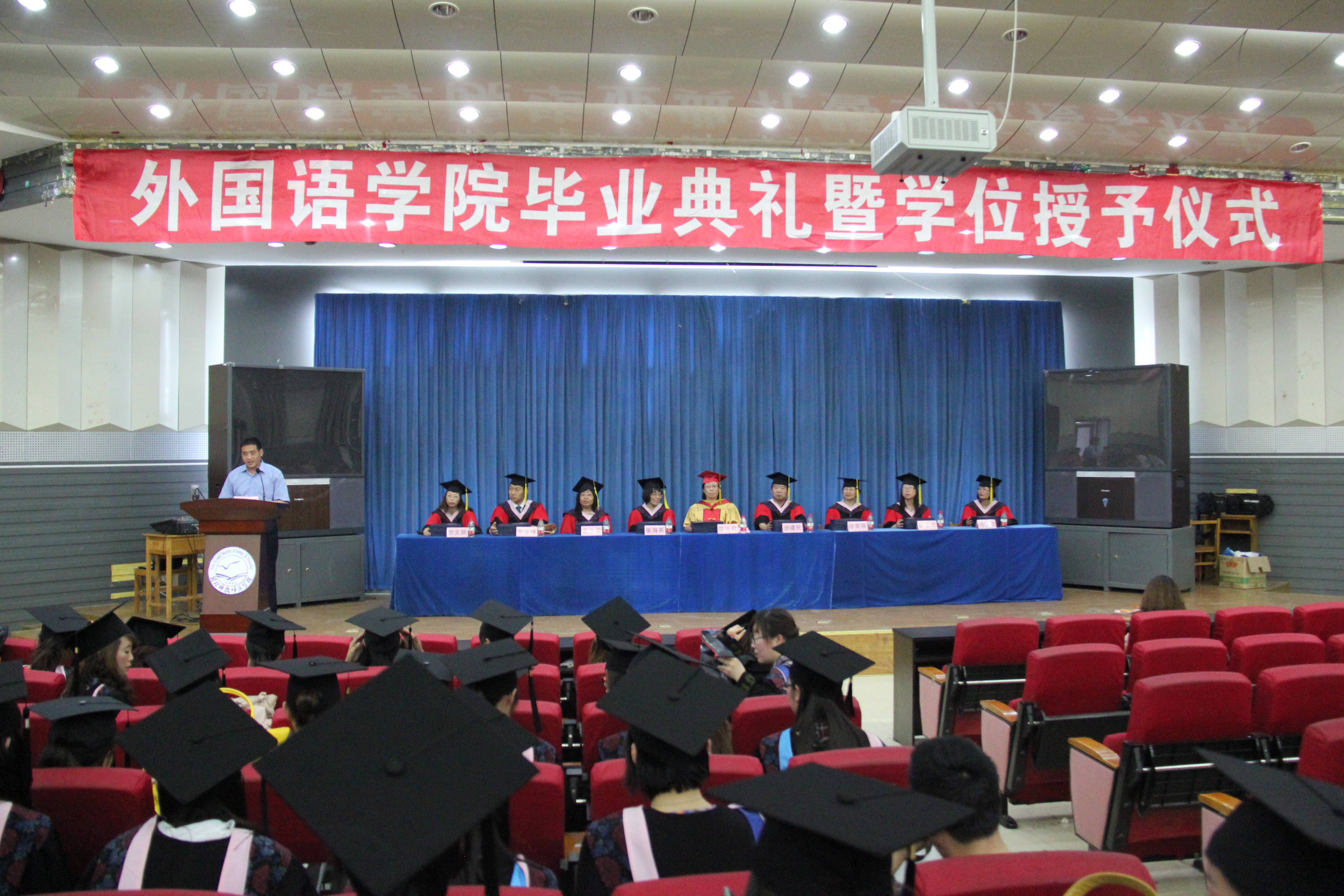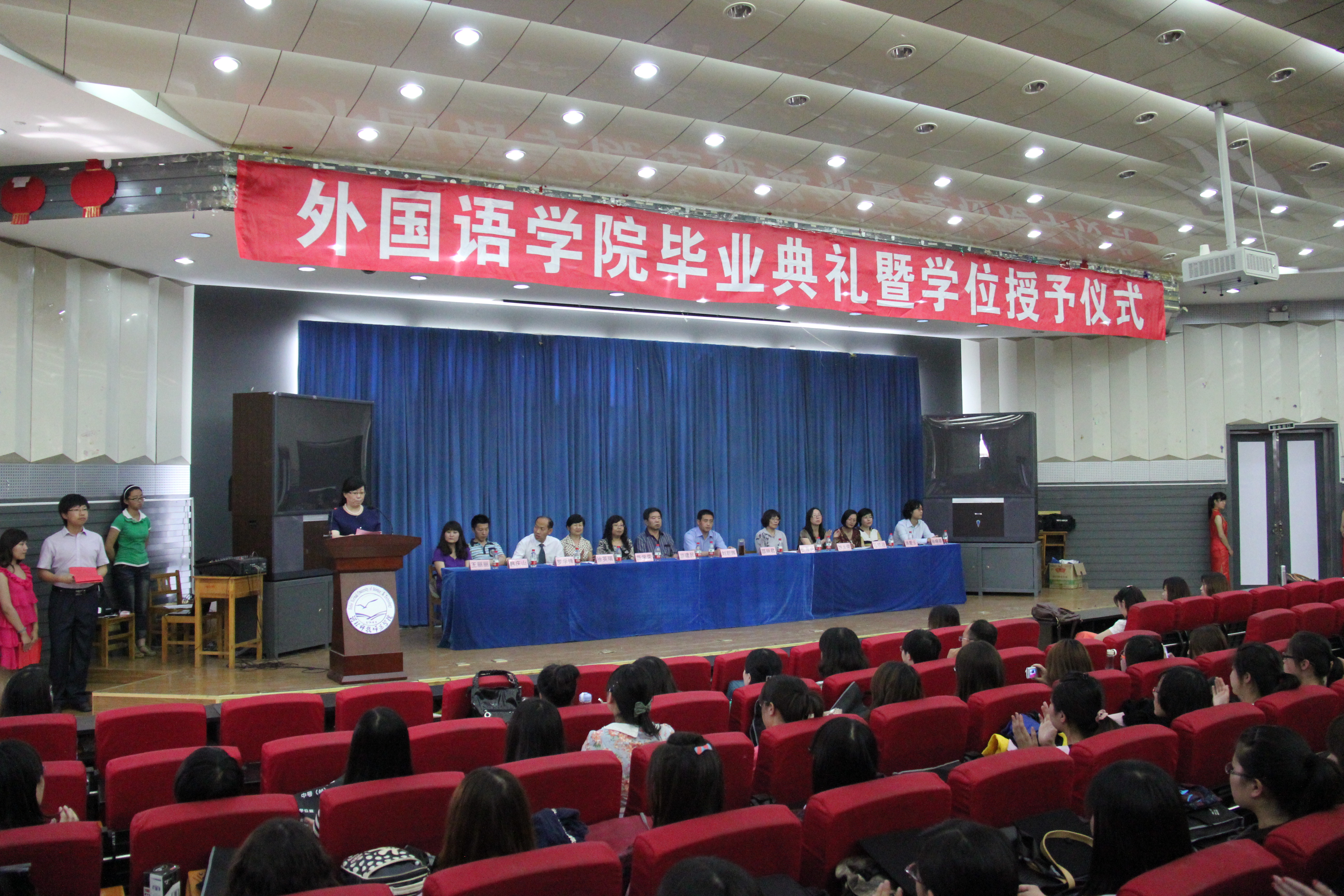 毕业典礼之后,由外国语公司党委书记刘朝晖老师主持了2012届本科毕业生学位授予仪式,授予学位的领导和导师有M88官方网站经理邵丽君教授;副经理游建民教授;副经理崔海英副教授;应用英语教学部主任主任马晓迎副教授;英语专业教研室主任范学荣副教授;旅游英语专业教学部主任罗学锋副教授以及英语专业徐英瑞教授,赵玉荣副教授、应用英语专业郭文颖副教授。大会由刘朝晖书记宣读校学位评定委员会主席的委托词,由M88官方网站经理邵丽君教授宣读授予学位的决议和名单,最后由各位导师为M88官方网站144名获得学士学位的毕业生授予学位并颁发学位证书。(邵东蕊)