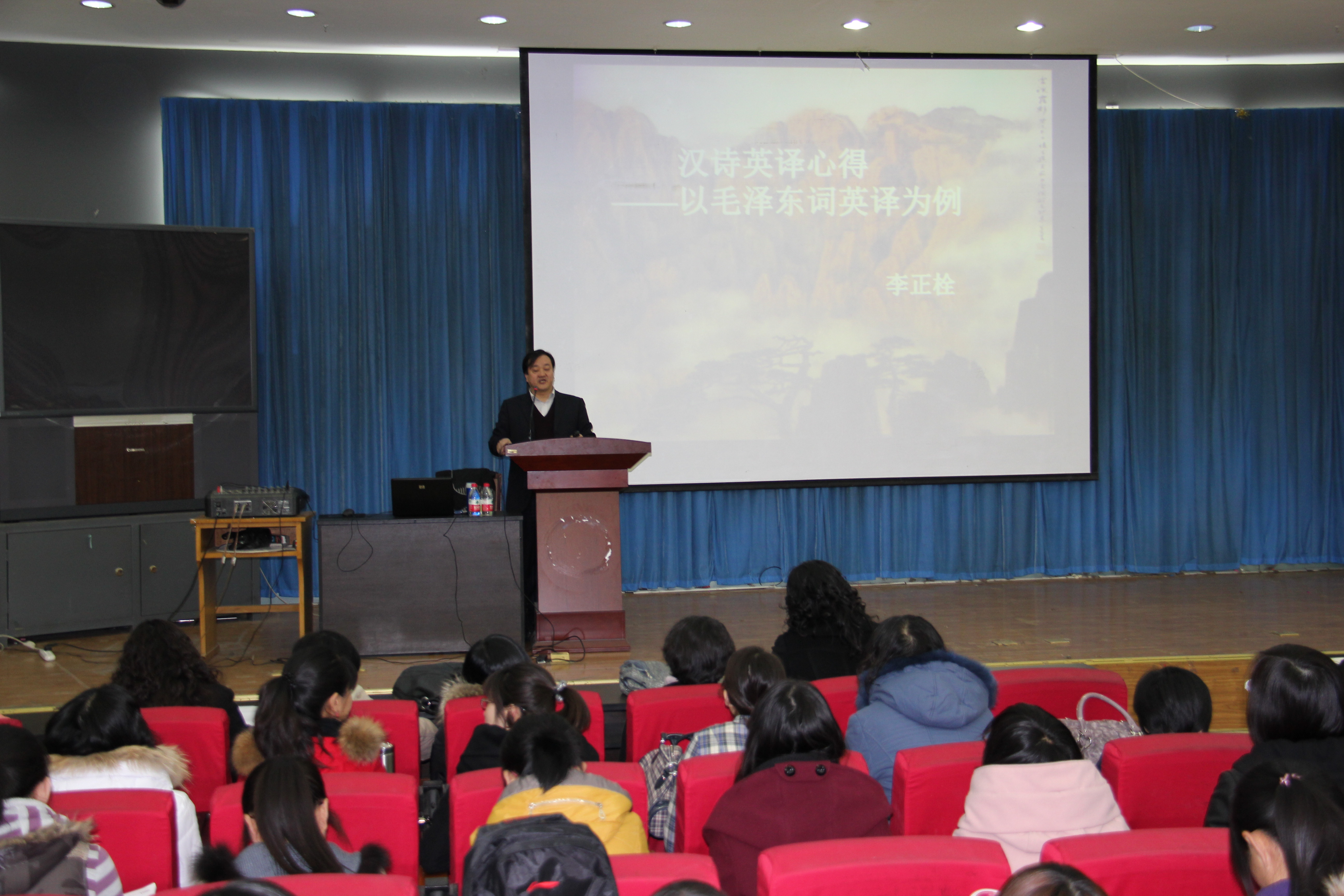 3月11日上午9点,在公司开发区校区综合楼二楼报告厅,河北师范大学M88官方网站经理、硕士研究生导师、河北师范大学学术带头人李正栓教授为公司M88官方网站的师生们做了一场题为《汉诗英译心得——以毛泽东词英译为例》的报告。