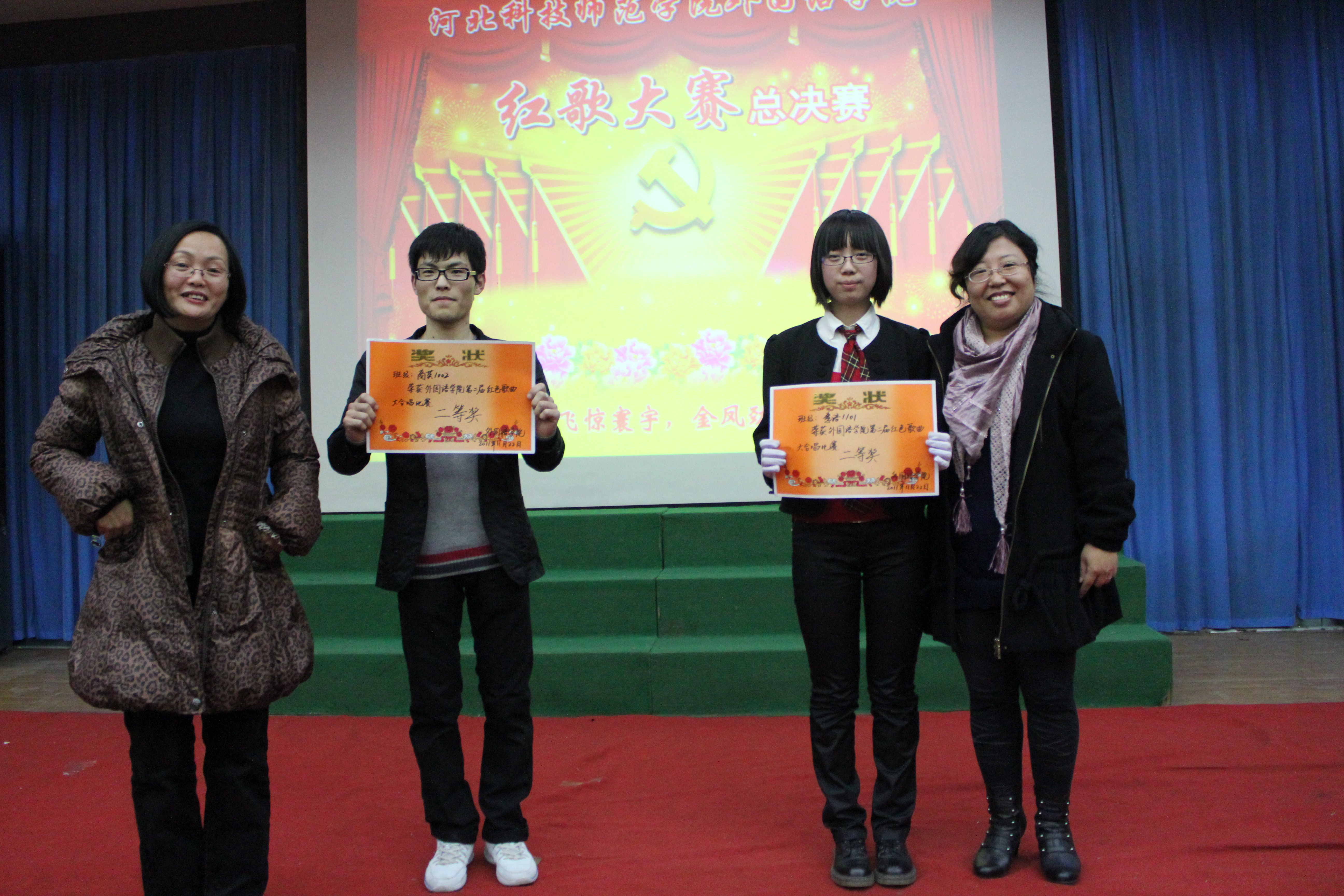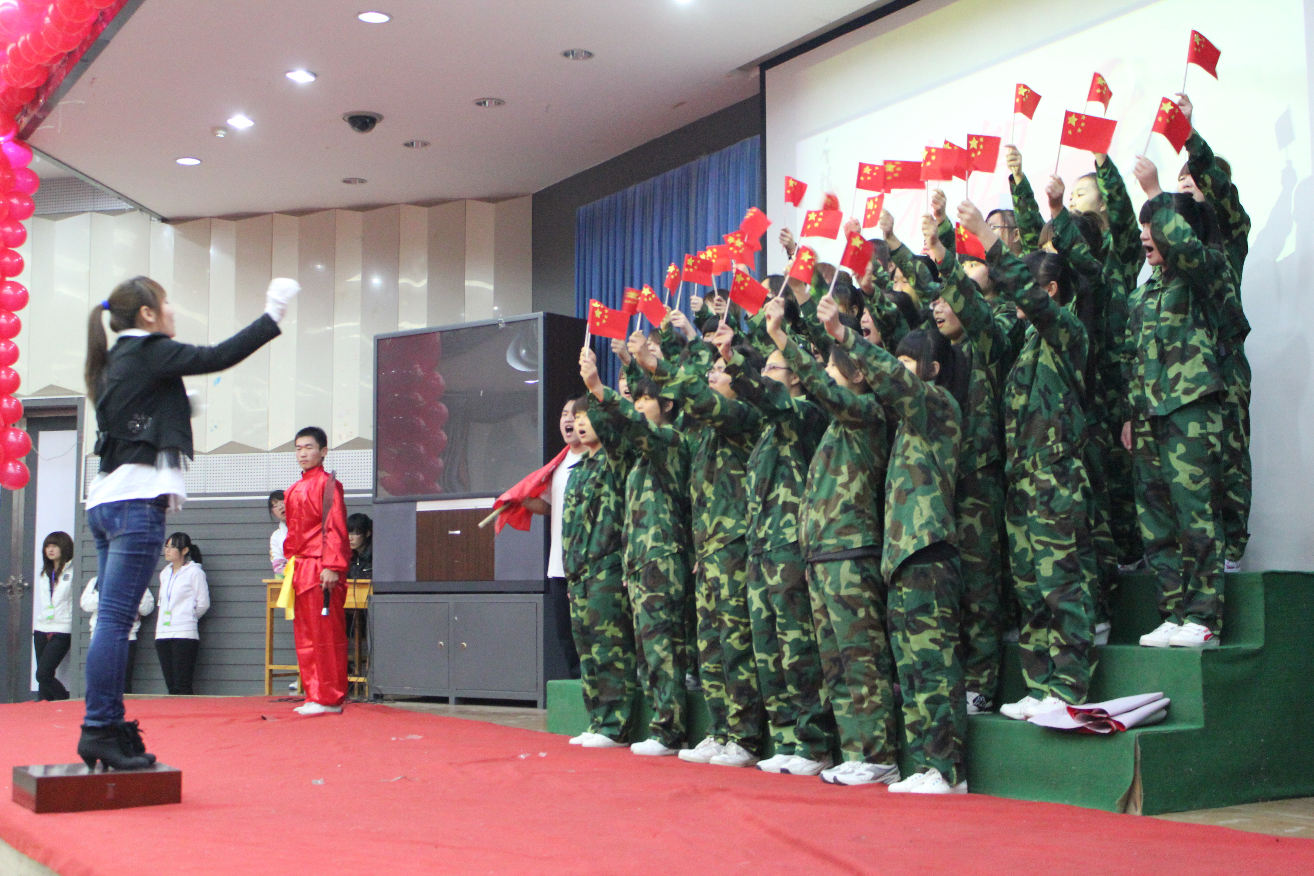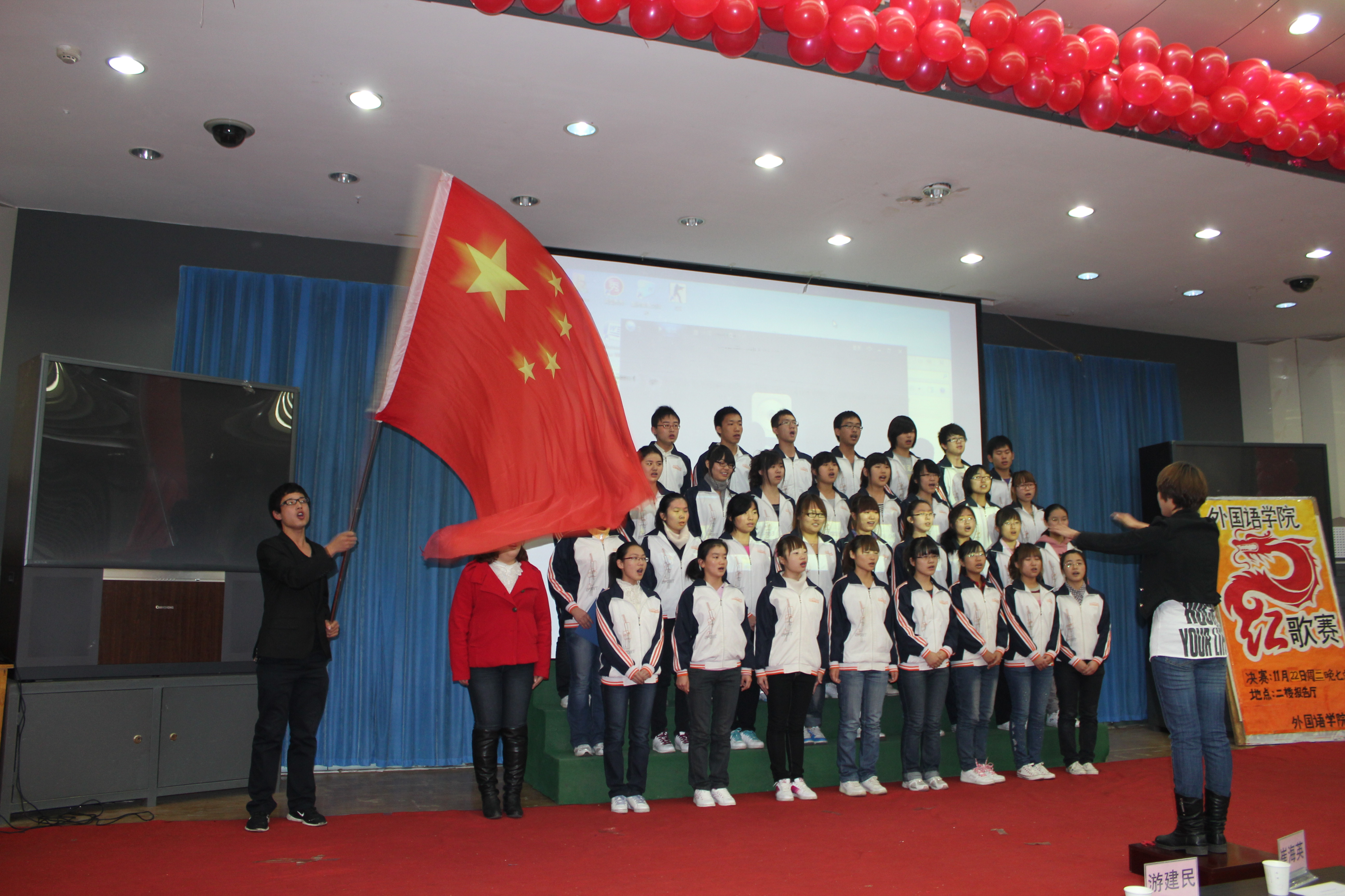 比赛在观看国庆大阅兵的庄严氛围中隆重开幕。参加比赛的班级为师生们带来了一场别开声面的视听盛会,比赛中员工们激情饱满,活力四射。旋律优美动人心弦,歌声嘹亮铿锵有力。《红色娘子军》、《国家》等一首首耳熟能详的红色歌曲唱出了同学们敢为人先,争创一流的时代风采,激起了大家对党对祖国的无限热情。手语、朗诵、武术、歌曲串烧、短话剧等多种多样的形式把比赛一次次推向高潮,台下不时爆发出热烈的掌声和激情的呐喊声。经过激烈的角逐,英本1001班最终以总分第一的成绩荣获桂冠,旅游英语1002班及英本1002班获得季军。