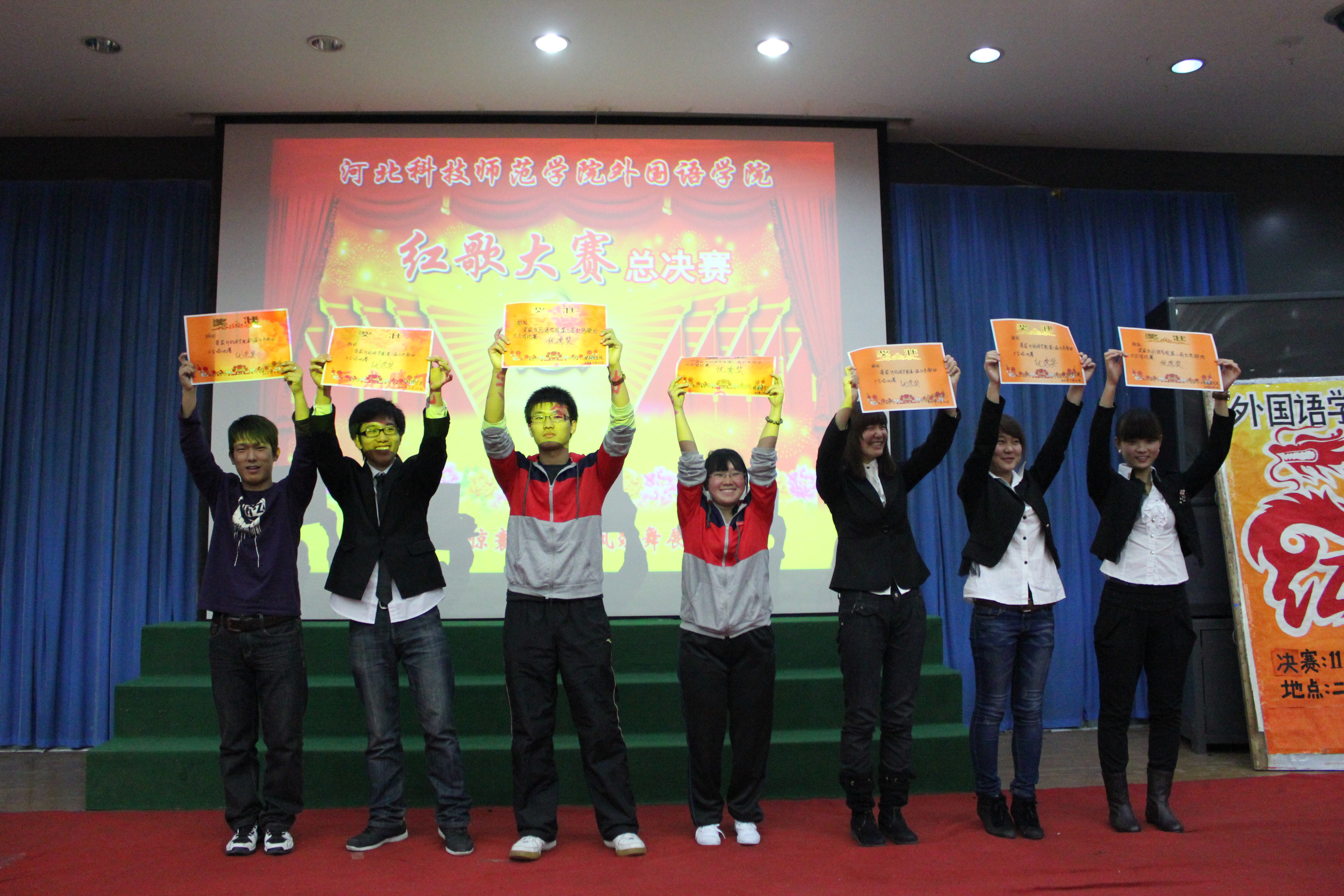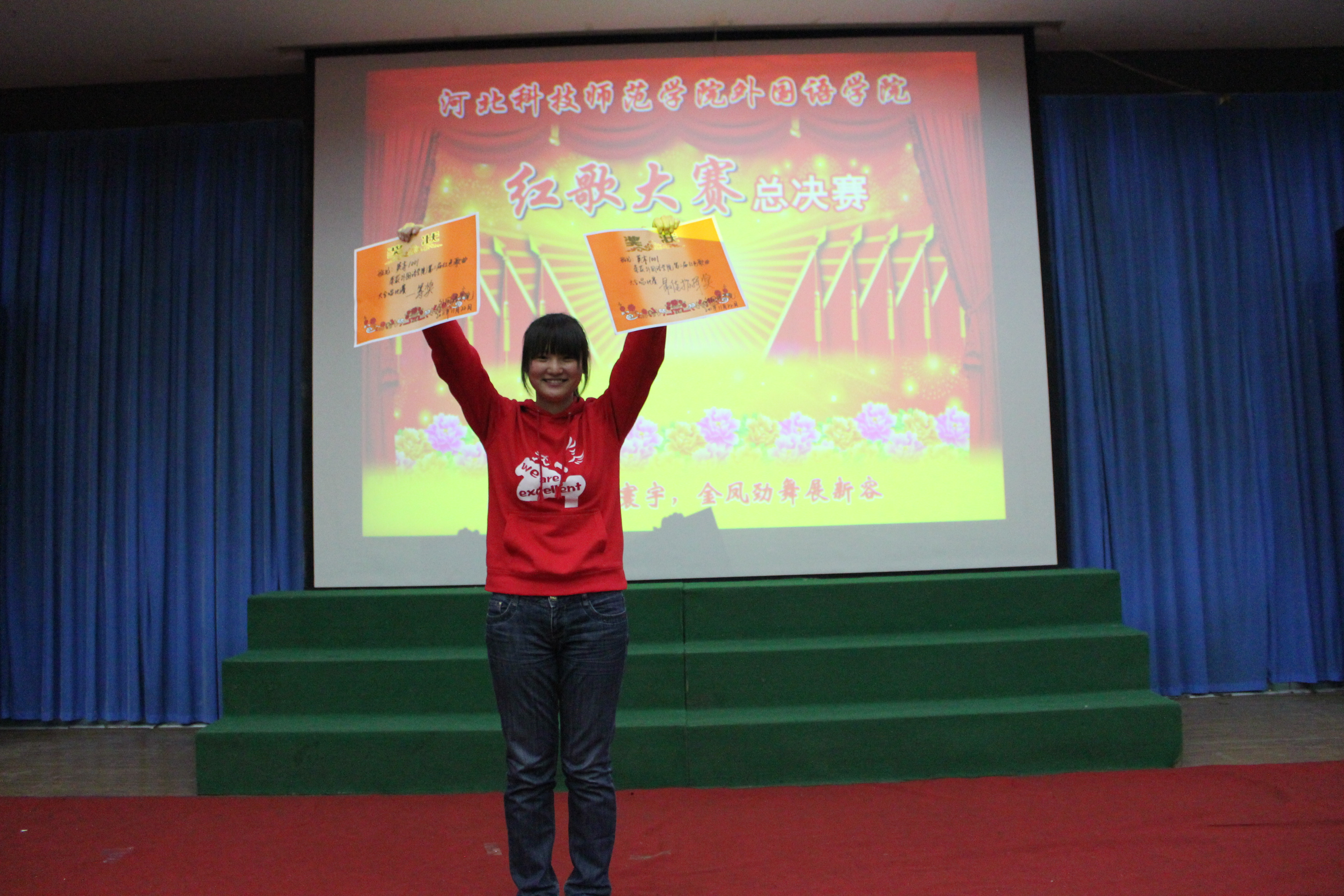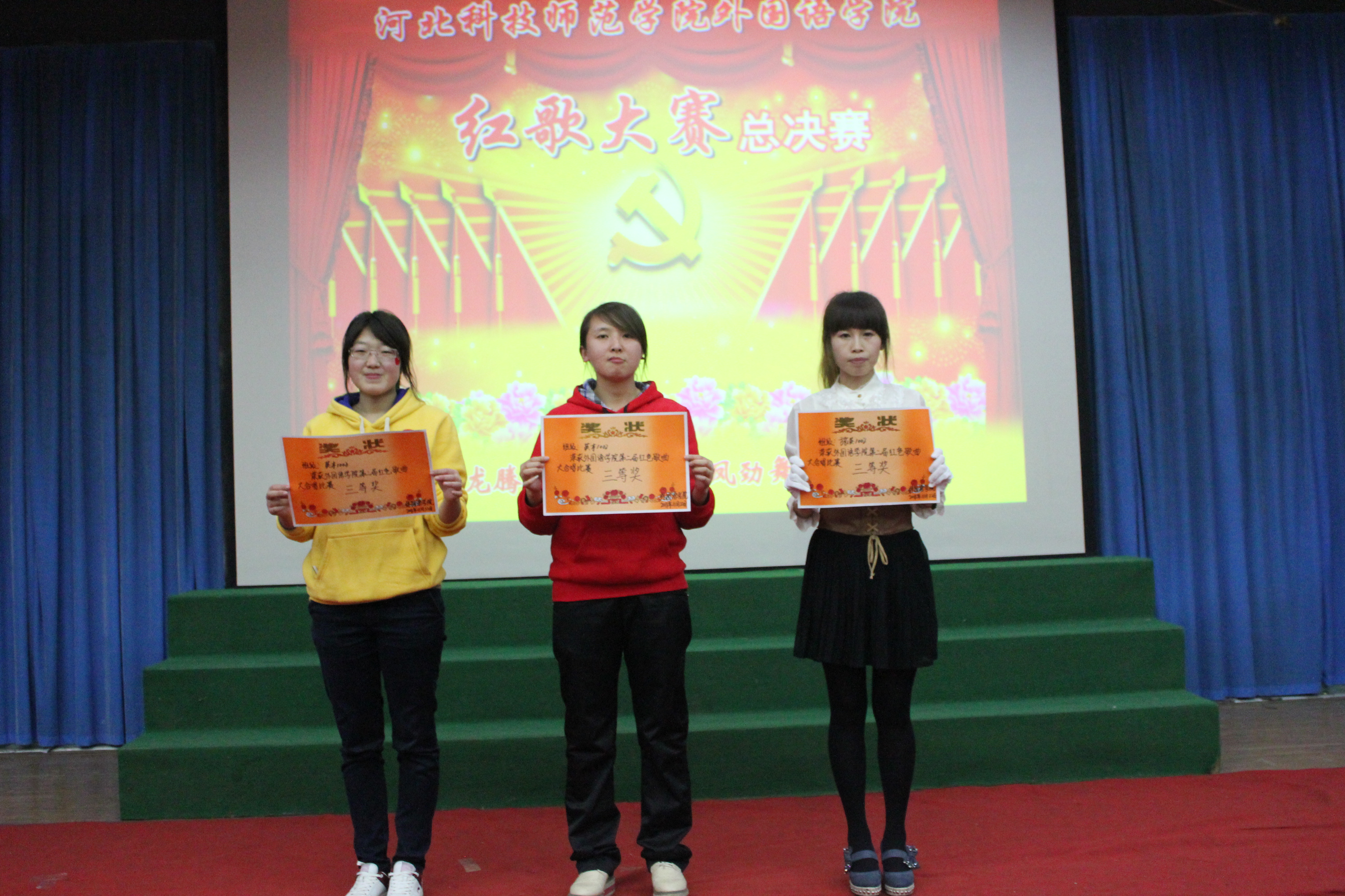 比赛在观看国庆大阅兵的庄严氛围中隆重开幕。参加比赛的班级为师生们带来了一场别开声面的视听盛会,比赛中员工们激情饱满,活力四射。旋律优美动人心弦,歌声嘹亮铿锵有力。《红色娘子军》、《国家》等一首首耳熟能详的红色歌曲唱出了同学们敢为人先,争创一流的时代风采,激起了大家对党对祖国的无限热情。手语、朗诵、武术、歌曲串烧、短话剧等多种多样的形式把比赛一次次推向高潮,台下不时爆发出热烈的掌声和激情的呐喊声。经过激烈的角逐,英本1001班最终以总分第一的成绩荣获桂冠,旅游英语1002班及英本1002班获得季军。