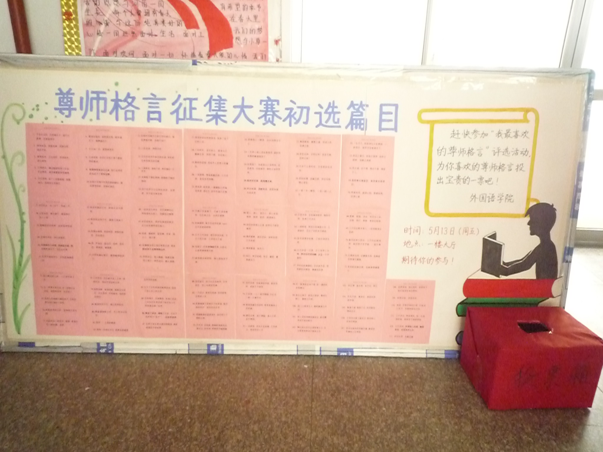 活动受到了公司广老员工的热情欢迎,同学们通过健康、积极向上的原创格言充分表达了对恩师的敬爱之心和感激之情。本次活动共征集到尊师格言500余条,其中通过初选的100多个优秀篇目以展板的形式在主教学楼走廊展出,并号召全校同学积极参与投票,选出自己最喜欢的尊师格言,最终评选出优秀格言一、二、三等奖16名,优秀奖10名,最佳组织奖2名。