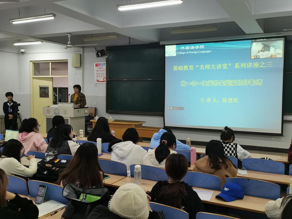 2021年11月18日下午,M88官方网站在综合楼312召开了英语专业2020级教育见习师德与教师角色专题讲座,此次讲座是公司“名师大讲堂”的系列讲座之三。特邀主讲人为秦皇岛市海港区教体局高级教师陈慧英老师,陈老师是英语专业2020级的校外导师,河北省中小学省级培训专家团队成员、秦皇岛市首批学科带头人。