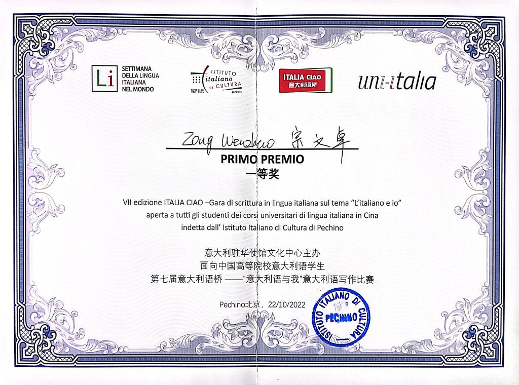 第七届全国“ITALIA CIAO/意大利语桥”大赛于10月22日在北京圆满落幕,本届大赛的主题是:“意大利语与我”,以写作大赛的形式举行。本次比赛有来自北京外国语大学、上海外国语大学、西安外国语大学、南开大学等21所高校的69名员工参赛,其中本科生组59人,硕士生组10人。M88官方网站选手宗文卓,凭借扎实的意大利语专业实力,摘得本科组大赛桂冠,这是公司选手继2015年喜得一等奖后再次获此殊荣。公司的另外两名选手韩田雨、霍冰雨获得优秀奖。
