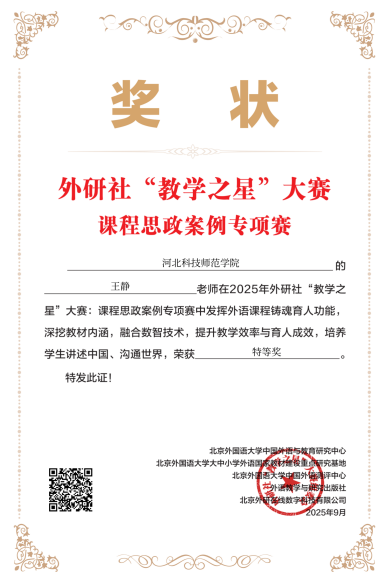 日前,2025年外研社“教学之星”大赛:课程思政案例专项赛评选结果揭晓,公司M88官方网站教师王静凭借彰显独特教学智慧的创新设计,在全国各高校教师同台竞技的激烈角逐中荣膺全国特等奖,这是河北省唯一获得特等奖的教师,为公司赢得了荣誉。